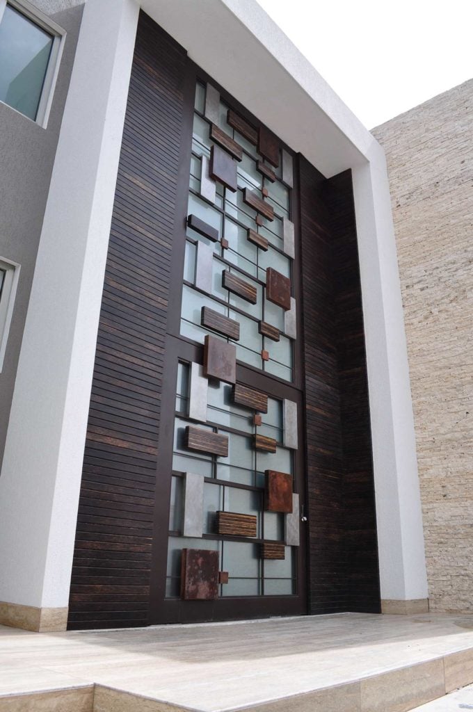 The twenty-foot structure consists of small blocks of copper, aluminum, stainless steal, and bronze squares and rectangles that create this modern pattern. The two side lights are made of solid wood planks, creates this unique design.