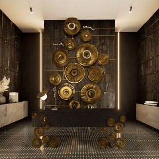This project was created for an exclusive office where refined design and craftsmanship converge in perfect harmony. At the entrance, a striking metal installation in copper tones rises from floor to ceiling, composed of interlocking circular forms that create a sculptural statement of elegance and sophistication.