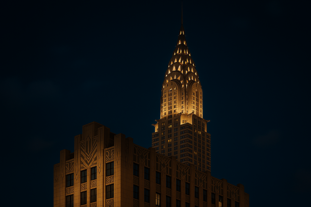 Arguably the most celebrated Art Deco skyscraper in the world, the Chrysler Building is a shimmering tribute to the Machine Age. Completed in 1930, its stainless-steel crown, tiered setbacks and stylized eagle gargoyles made it a symbol of modernity and power.