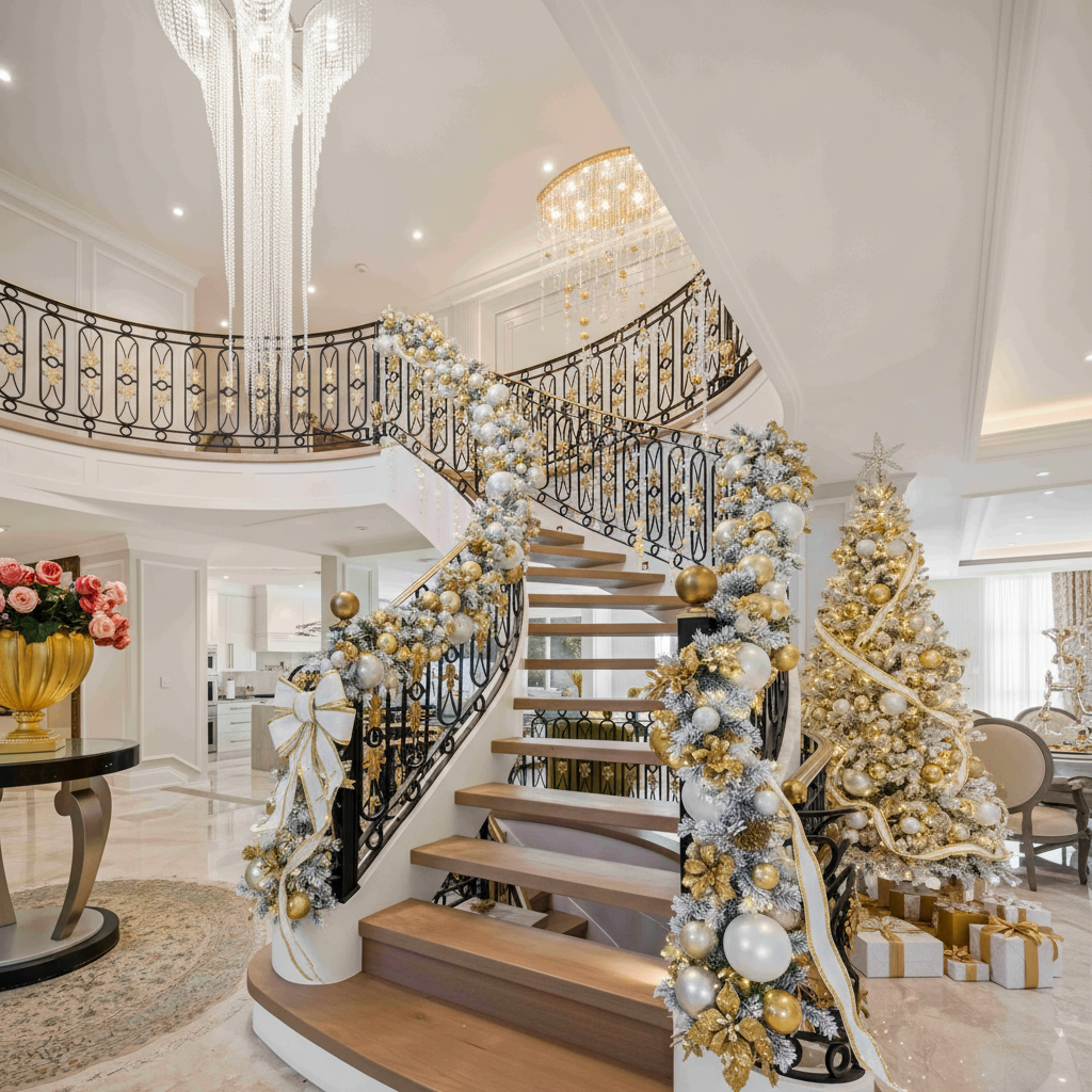 From grand staircases draped in rich garlands to contemporary spaces accented with golden tones, the right design approach turns your holiday décor into an unforgettable visual experience.